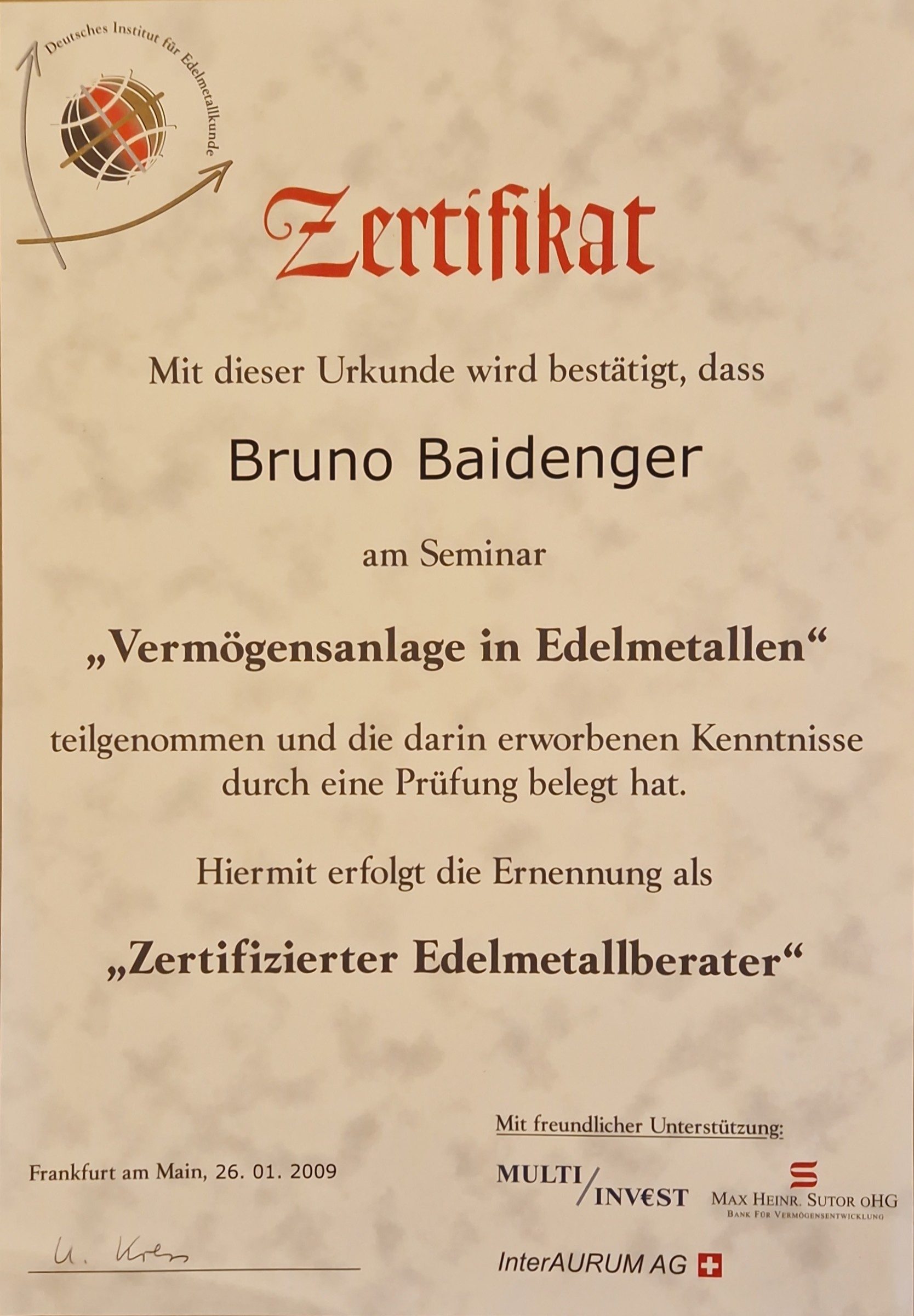 | 2009 | Zertifizierter Edelmetallberater (DIE) |