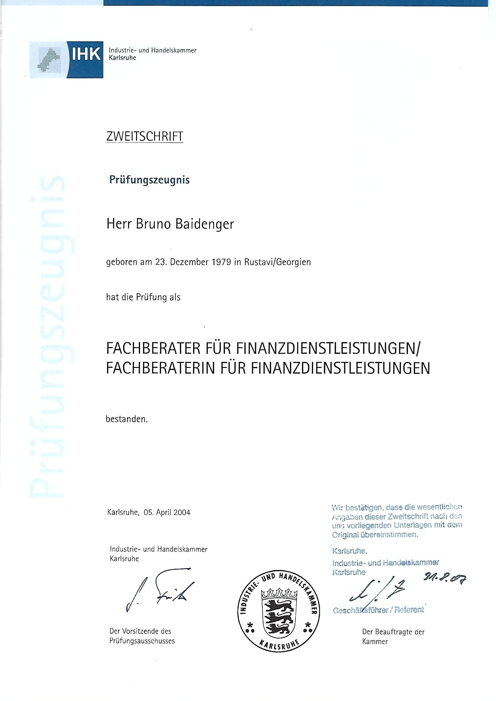 | 2004 | Fachberater für Finanzdienstleistungen (IHK) |