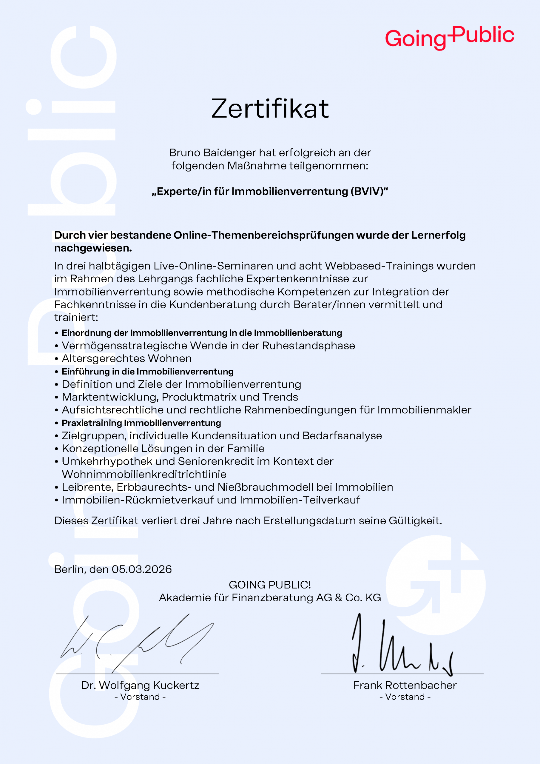 | 2026 | Experte für Immobilienverrentung (BVIV) |